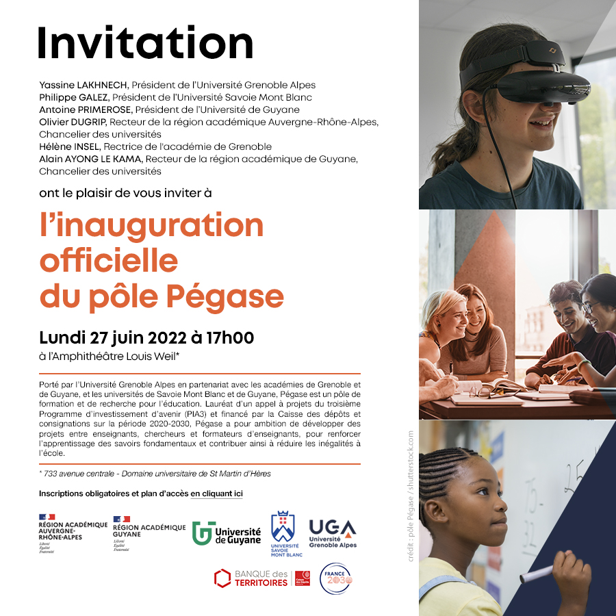 Depuis dix-huit mois d’existence, le projet a connu son premier déploiement. Plusieurs réalisations ont déjà vu le jour, qu’il s’agisse de formation des enseignants, de recherche collaborative, ou de dissémination. En raison de la crise sanitaire, le lancement officiel de Pégase n’a pas pu avoir lieu en 2020. L’inauguration sera organisée le lundi 27 juin à 17h00 (ouverture à 16h30) à l’amphi Weil de l’Université Grenoble Alpes (campus de Saint-Martin-d’Hères) pour présenter les enjeux du projet ainsi qu’un premier bilan.