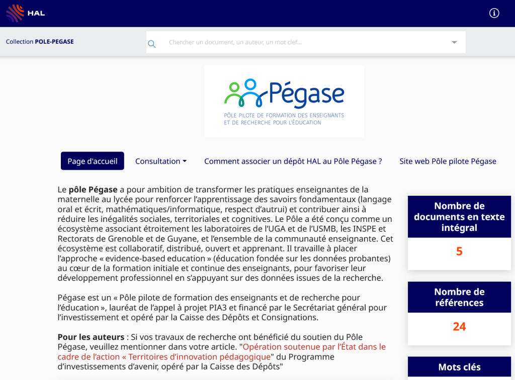 Le pôle Pégase a créé sa collection sur la plateforme HAL. L’ambition est de rassembler dans un même espace les publications scientifiques produites par les chercheur.e.s de Pégase et ainsi faciliter l’accès à des productions scientifiques de qualité sur les thématiques du pôle. Les chercheur.e.s de Pégase sont invités à associer leurs publications à la collection (un tutoriel est à votre disposition)