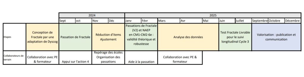 (CSEN, 2023) et seulement 50% des élèves américains de 8e année (13 ans) ordonnent correctement trois fractions (NCTM, 2007). Une des raisons de ces difficultés réside dans le fait que les fractions, en tant que représentant d’un nombre rationnel, marquent une rupture avec les entiers : de nombreuses propriétés sont vraies pour les nombres entiers et ne le sont pas pour les nombres rationnels (Ni & Zhou, 2005). Pour répondre à ces difficultés, il est crucial que les enseignants disposent d’un outil d’évaluation précis, capable de cibler les lacunes et les acquis des élèves du concept de fractions. Or, à notre connaissance, il n’existe aucun outil validé scientifiquement répondant spécifiquement aux besoins des enseignants français. Dans ce contexte, le présent projet a pour objectif de fournir aux enseignants un outil d’évaluation, Fractale, conçu pour évaluer la compréhension des fractions chez les élèves âgés de 9 à 11 ans. Fractale sera normé et offrira une analyse multidimensionnelle des connaissances des élèves avec des mesures psychométriques assurant sa fiabilité et sa qualité.