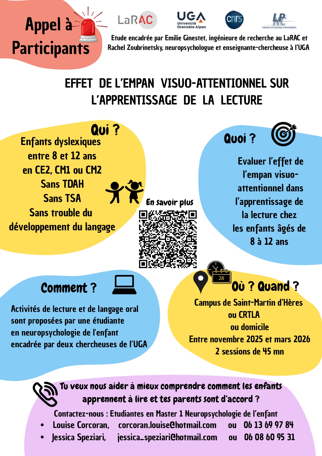 Le PupilLab cherche des enfants dyslexiques de 8-12 ans scolarisés en CE2, CM1 ou CM2 pour participer à une étude évaluant l’impact des capacités visuo-attentionnelles sur l’apprentissage de la lecture. Cette étude pourrait potentiellement conduire au développement d’outils de remédiation pour les enfants dyslexiques.