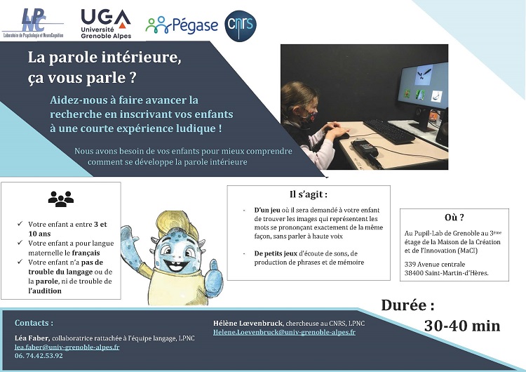 L’objectif de cette étude est de décrire comment la parole intérieure se développe chez les enfants. En particulier, nous cherchons à mieux comprendre à partir de quel âge les enfants sont capables de générer le son des mots dans leur tête et comment ils utilisent la parole intérieure pour mémoriser, raisonner, etc.