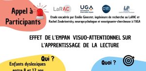 Le PupilLab cherche des enfants dyslexiques de 8-12 ans scolarisés en CE2, CM1 ou CM2 pour participer à une étude évaluant l’impact des capacités visuo-attentionnelles sur l’apprentissage de la lecture. ...